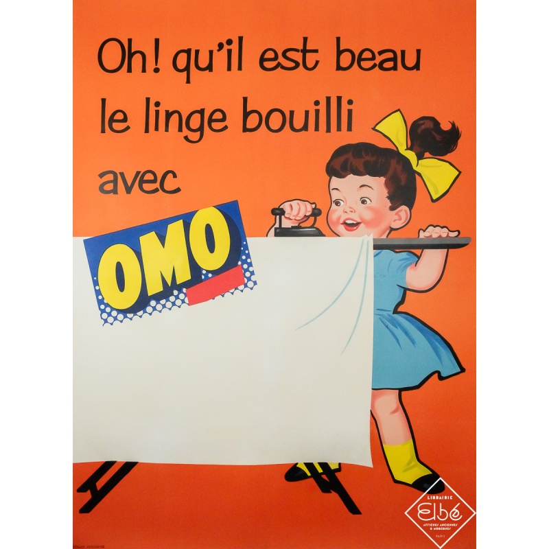 Affiche ancienne originale de publicité Circa 1955, Omo lessive - Oh ! Qu'il est beau le linge bouilli avec Omo